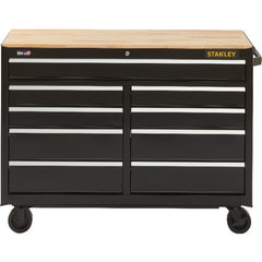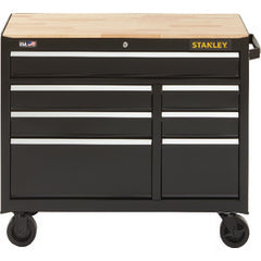 •Double wall steel construction holds up to frequent use. •85 lb. full-extension ball-bearing drawer slides operate smoothly. •1-1/2″ thick solid wood work surface is sealed to provide a durable work space. •5″ x2″ casters support 1,100 lbs. two lock and swivel. •Full-width top drawer and deep bottom drawers can store long tools, power tools, and cases. •Keyed internal locking system safeguards tools.