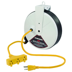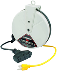 •30' 16/3 (SJT) •Polarized plug with three 10 Amp grounded receptacles •Heavy-duty metal retractable reel •Brackets for wall or ceiling mounting (included) •LED Power status light