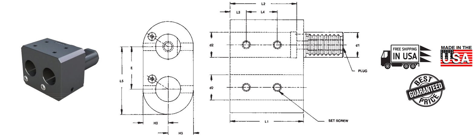 | d1 | d2 in | d2 mm | E | H3 | L1 | L2 | L3 | L4 | L5 | Set Screw | Plug | Part Number |