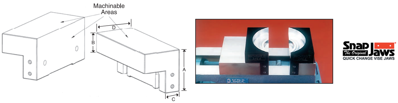 Top Jaws unique āLā shaped design fits over the top of the vise for greater machinable area. You machine the jaws to fit your application. Great for odd shapes, delicate rings or disks. Available in steel or aluminum.