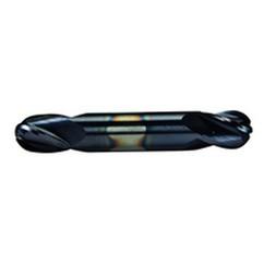 •Solid carbide double end mills stub length •Spector 4 flute ball end E24B •Exceptional general purpose coating for most materials at elevated speeds and feeds •Great for 300 series stainless steels •Stub length double end geometry offers added strength and excellent rigidity •Typical uses are machining shallow slots and keyways •Double end offers added economy, but care must be taken to prevent edge chipping when loading tools into tool holders •Precision ground for reliability and repeatability •Fine grain carbide for greater toughness and wear resistance