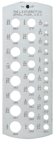 •Brand Name: Starrett •Model Number: 187 •Number of Holes: 2-5/16 x 6-1/4 •Size: 1/16 to 1/2 by 64ths •Type: Drill Gage